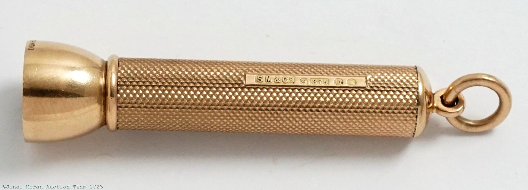 9K rose gold cigar piercer retailed by Alfred Dunhill of London, the piercer was made by Sampson Mordan & Co. with hallmarks that date it to 1939, measures 14mm x 64mm, a fabulous little piercer for the gentleman who enjoys a nice cigar. Includes the original leather wrapped presentation box signed Alfred Dunhill. Gross weight of cigar piercer 8.8 dwt (13.8 g).